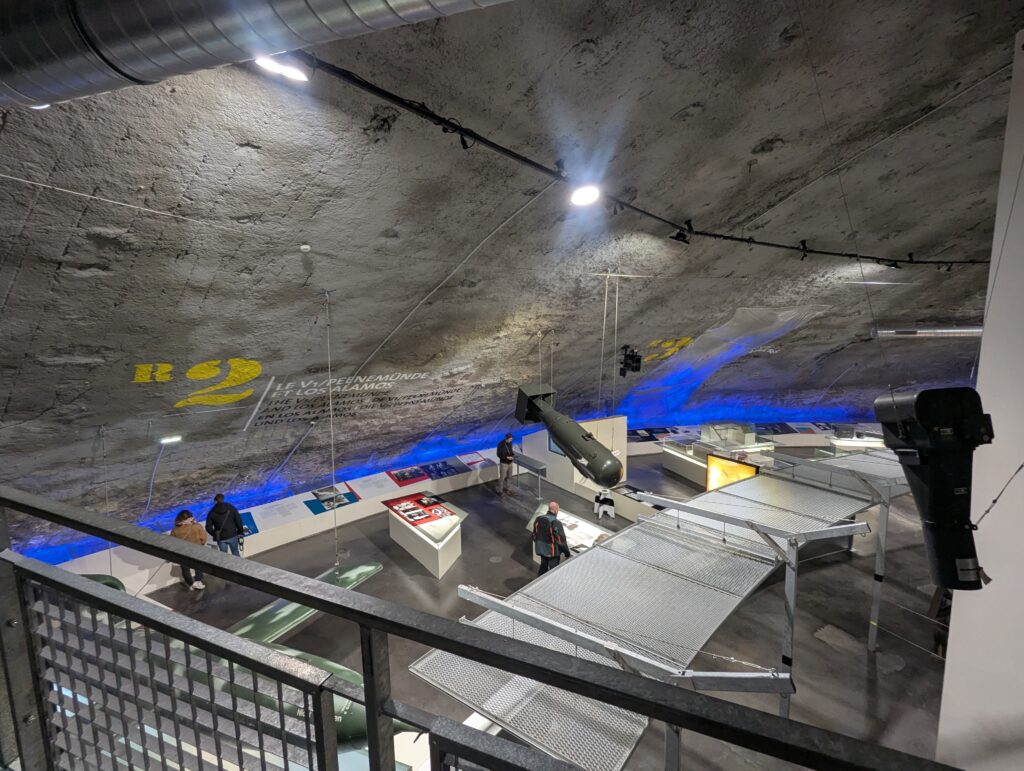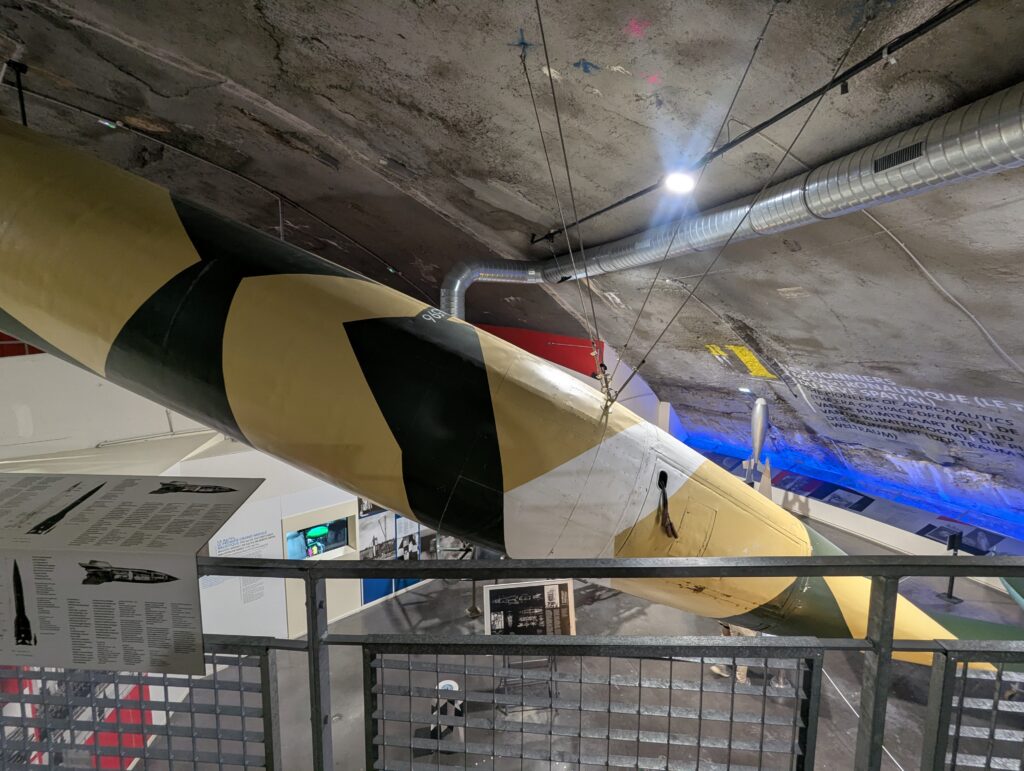 博物館內岩體底下,也有展示真實大小的火箭模型,從 V1 火箭到 V2 火箭,很難想像如果被真的火箭炸到的話會有多少死傷?